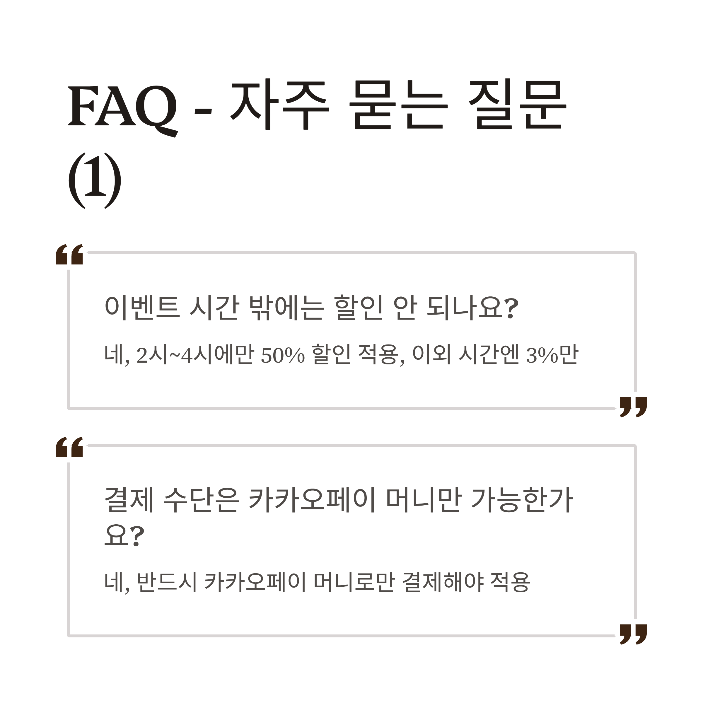 | Q: 이벤트 시간 밖에는 할인 안 되나요? | A: 네, 2시~4시에만 50% 할인 적용, 이외 시간엔 3%만 |