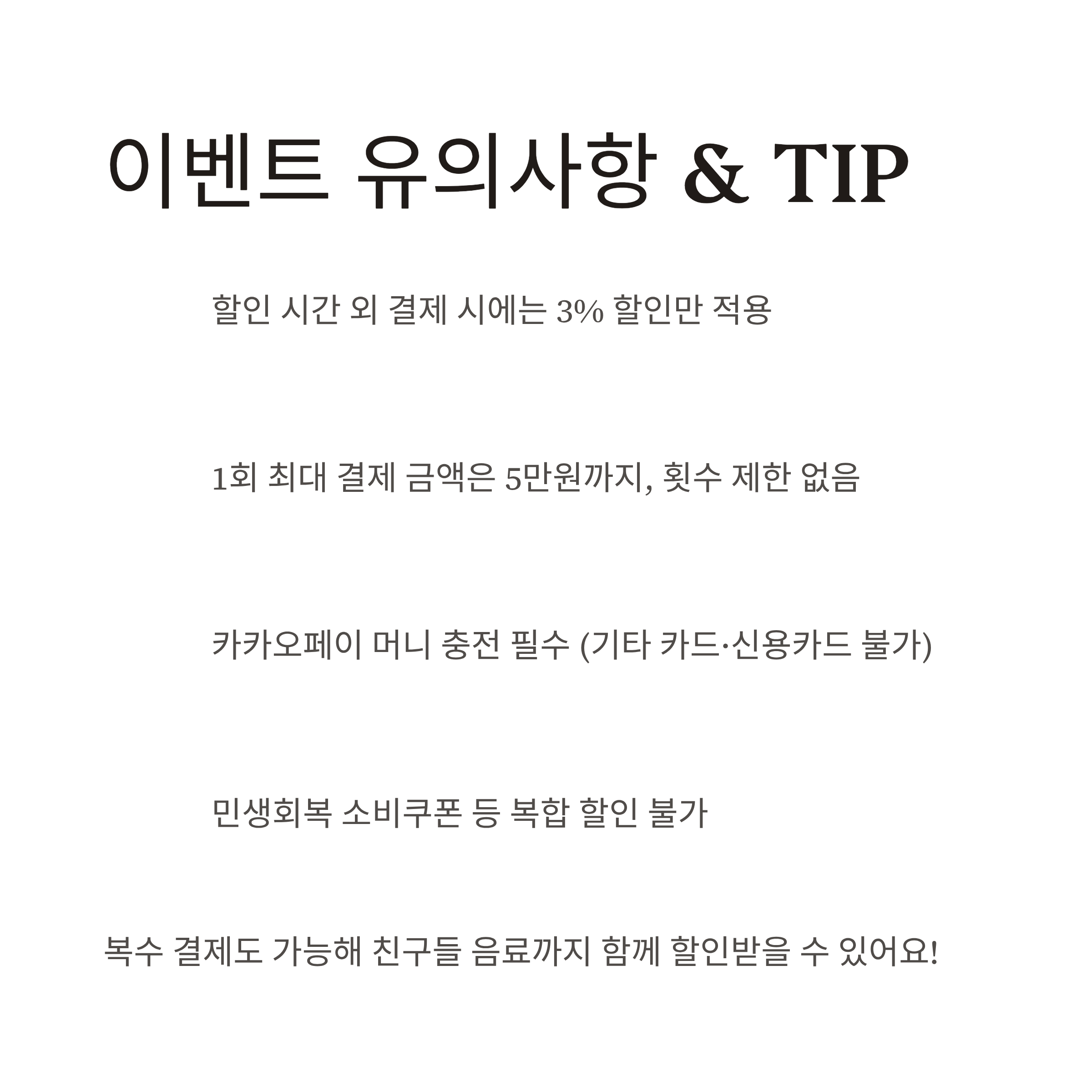 - 할인 시간 외 결제 시에는 3% 할인만 적용됩니다.
