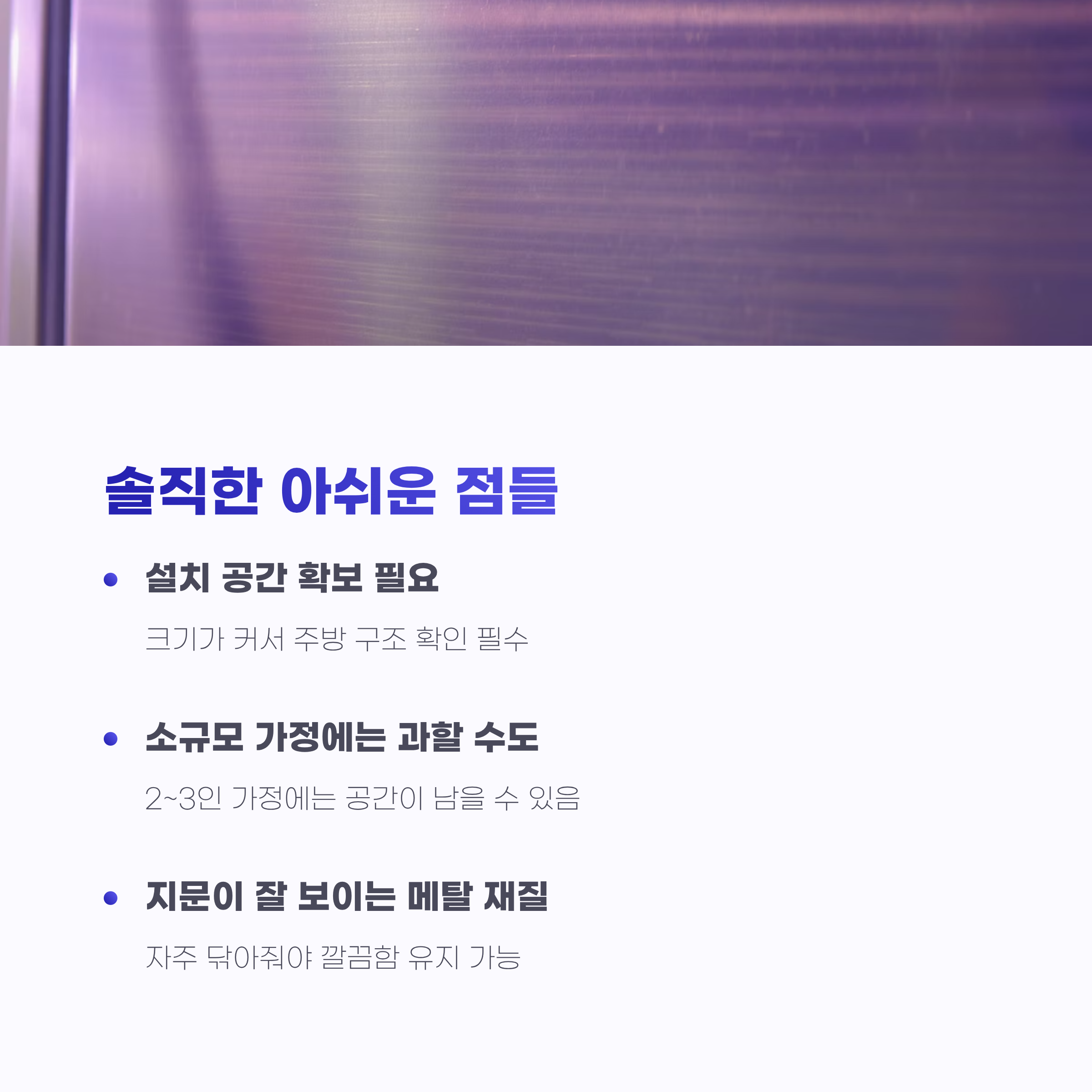 좋은 점만 말하면 솔직하지 않겠죠. 일단 크기가 크다 보니 설치 공간 확보는 꼭 필요해요. 저희도 기사님 오시기 전에 주방 구조를 여러 번 확인했는데, 다행히 딱 들어맞았어요. 하지만 공간이 좁은 집이라면 설치가 어려울 수도 있을 것 같아요.